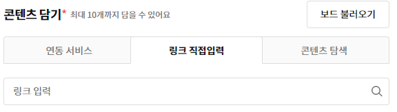 넣고자 하는 콘텐츠를 검색을 통해서 찾아낸 이후에는 링크를 복사해서 링크 직접입력으로 하는 것이죠.